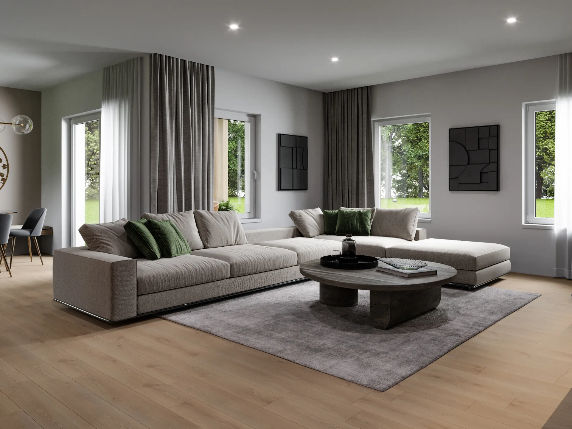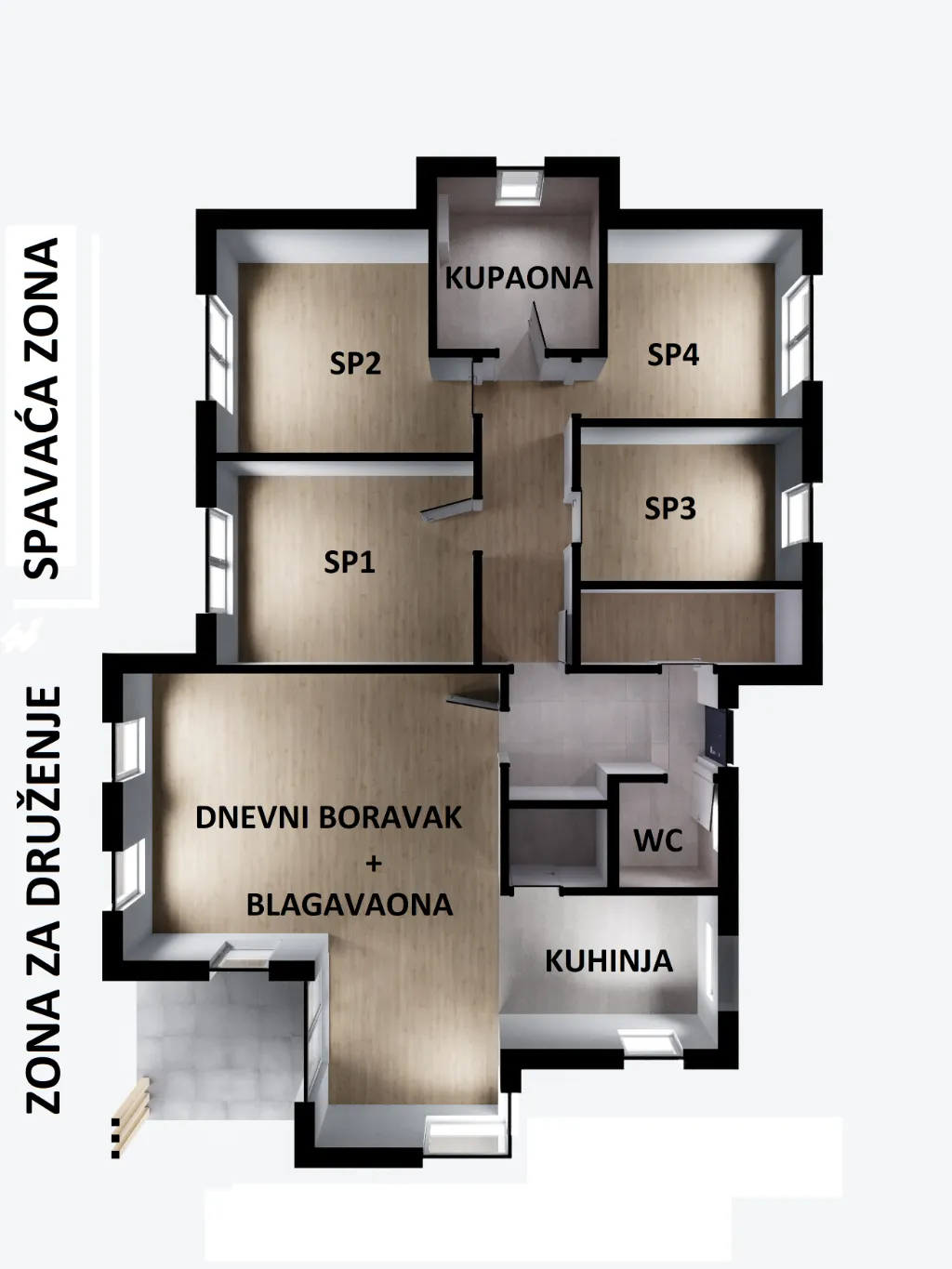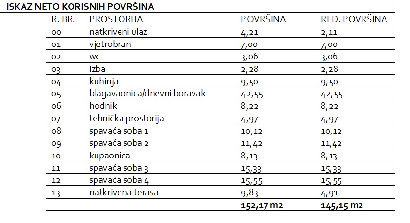 Dnevni boravak, prostorija u kojoj provodimo najaktivniji dio svog slobodnog vremena, prostire se na čak 52 m2 a čine ga boravak, blagovaonica te kuhinja. Smješten je na idealnoj poziciji, jugoistoku ili jugozapadu, te je velikim kliznim panelom direktno povezan sa natkrivenom terasom i dvorištem. Velike površine daju dnevnom boravku poseban ugođaj, prozračnost, dobru osvijetljenost, udobnost i dobrodošlicu. U drugom dijelu kuće smjestile su se četiri spavaće sobe i kupaonica. Time je tlocrt kuće idealno iskorišten i podijeljen na dvije zone; intimnu (spavaću) zonu i zonu za druženje.