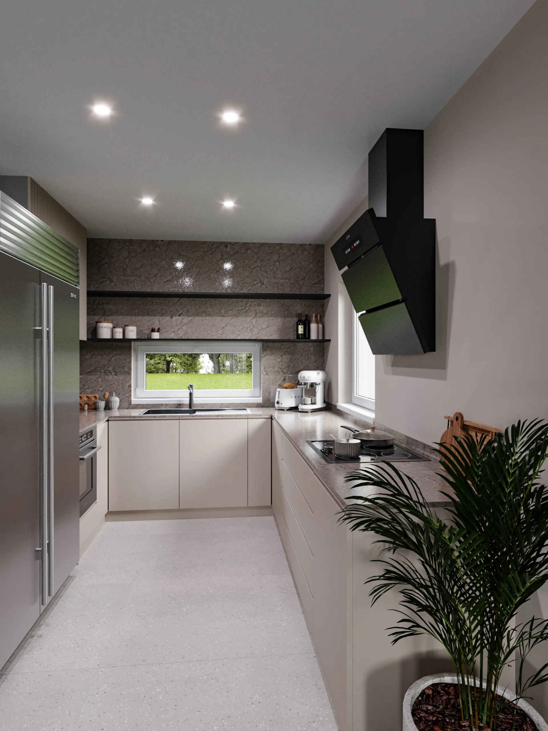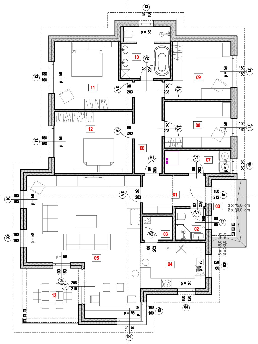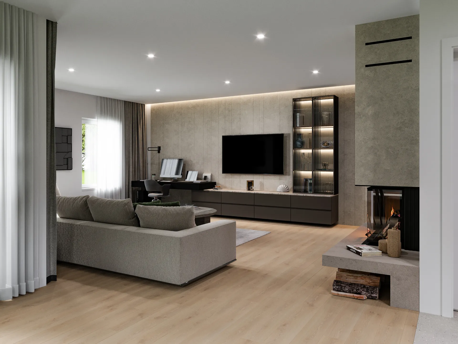 Dnevni boravak, prostorija u kojoj provodimo najaktivniji dio svog slobodnog vremena, prostire se na čak 52 m2 a čine ga boravak, blagovaonica te kuhinja. Smješten je na idealnoj poziciji, jugoistoku ili jugozapadu, te je velikim kliznim panelom direktno povezan sa natkrivenom terasom i dvorištem. Velike površine daju dnevnom boravku poseban ugođaj, prozračnost, dobru osvijetljenost, udobnost i dobrodošlicu. U drugom dijelu kuće smjestile su se četiri spavaće sobe i kupaonica. Time je tlocrt kuće idealno iskorišten i podijeljen na dvije zone; intimnu (spavaću) zonu i zonu za druženje.