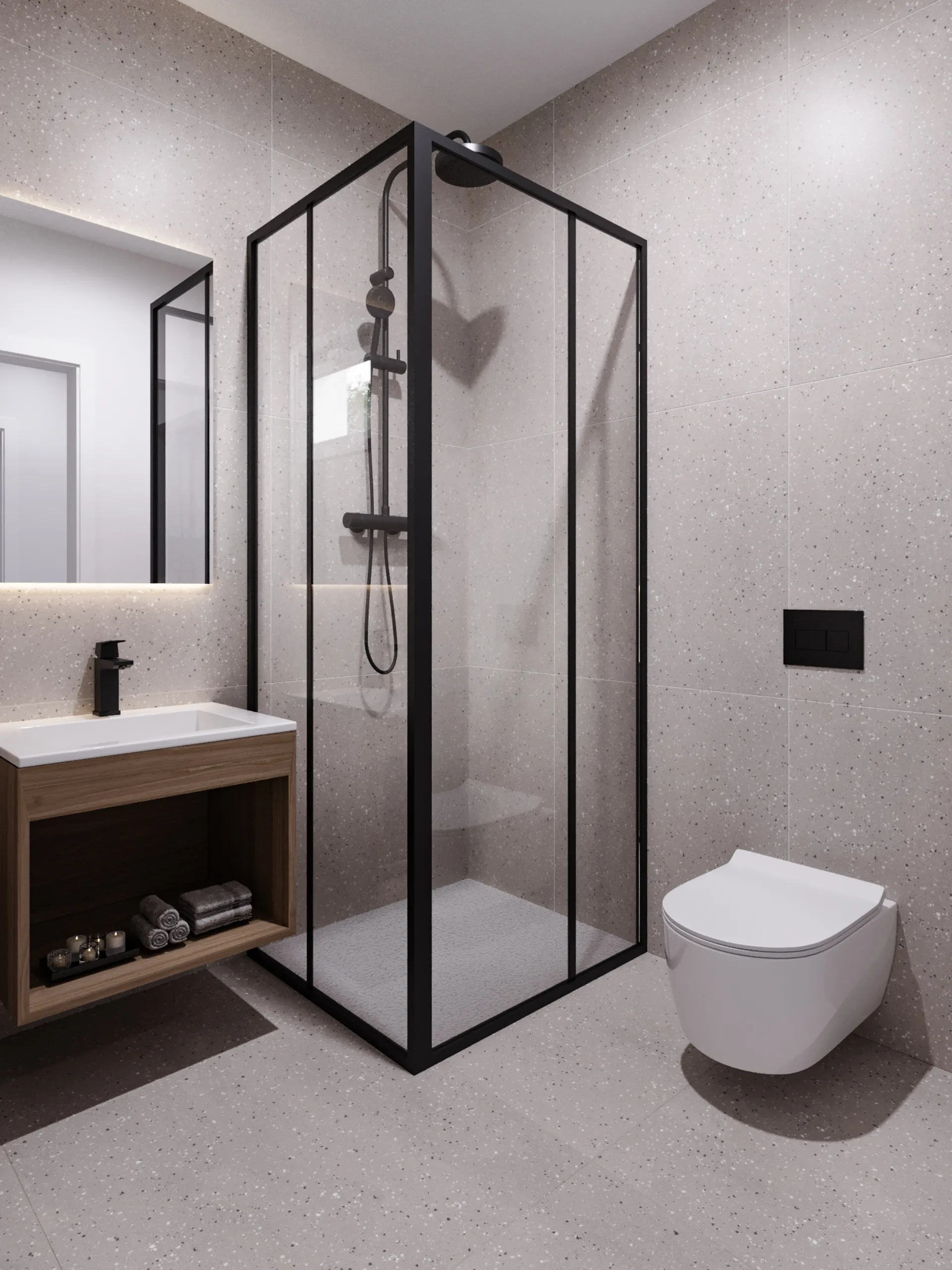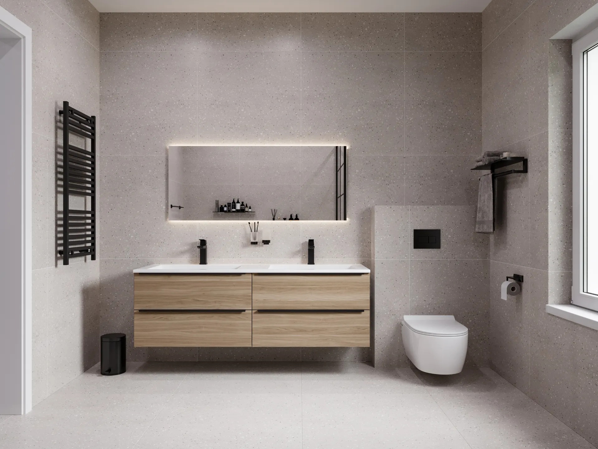 - Zidovi i podovi kupaonica obloženi su keramikom, te je ugrađen vrhunski Aquaestil namještaj. U velikoj kupaonici su dodatno instalirane radijator ljestve sa umetnutim elektro grijačem